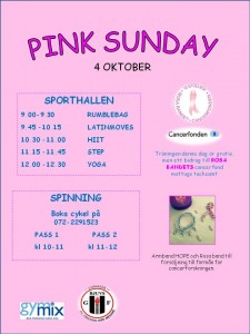 Pink Sunday Posted on 18 september, 2015 by Bjuvs Gymnastikförening Missa inte denna dag – Söndagen den 4 oktober. Mycket glädje i kombination med träning – allt för ett gott syfte! Ta gärna på dig en liten rosa detalj denna dag.