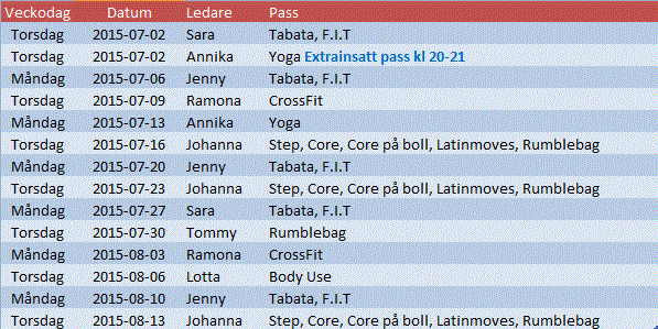 Under 10 veckor (v 24-33) har vi tre pass/vecka enligt nedan schema, detta för en kostnad av 300:- Alternativet att betala per gång finns också, då kostar det 20:-