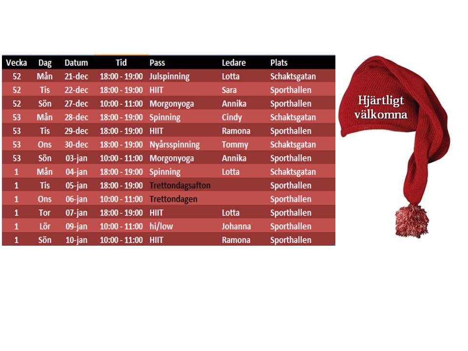 Vi vill främja folkhälsan och bjuder in alla (medlem som icke medlem) att träna hos oss på bestämda dagar och veckor under jul & nyår. Ta med en när & kär så har vi roligt tillsammans!